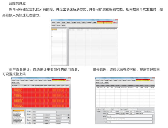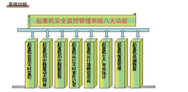•- 通過起重機(jī)安全監(jiān)控管理系統(tǒng),運(yùn)行管理人員可以通過系統(tǒng)對(duì)起重機(jī)運(yùn)行中出現(xiàn)的故障進(jìn)行 查詢和處理;對(duì)設(shè)備及元器件進(jìn)行系統(tǒng)管理;指導(dǎo)定期對(duì)系統(tǒng)進(jìn)行維修和調(diào)試。系統(tǒng)具備以 下功能:實(shí)時(shí)狀態(tài)顯示、實(shí)時(shí)報(bào)警顯示、歷史記錄查詢、部件壽命監(jiān)測(cè)、事故診斷分析、數(shù) 據(jù)統(tǒng)計(jì)及權(quán)限設(shè)定管理等。