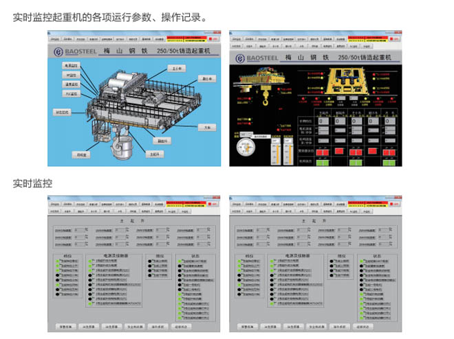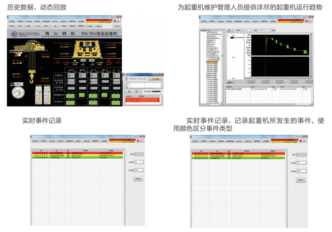 •-1、起重機(jī)狀態(tài)實(shí)時(shí)監(jiān)測(cè):對(duì)事故易發(fā)設(shè)備和重點(diǎn)關(guān)鍵設(shè)備的運(yùn)行情況進(jìn)行實(shí)時(shí)監(jiān)測(cè),同時(shí) 對(duì)采集的數(shù)據(jù)進(jìn)行分析整理,并把現(xiàn)場(chǎng)的實(shí)際數(shù)據(jù)與相關(guān)的設(shè)備運(yùn)行指標(biāo)進(jìn)行對(duì)比,超過偏 差限制時(shí)產(chǎn)生報(bào)警信息并存儲(chǔ)報(bào)警記錄。共享相關(guān)數(shù)據(jù),為及時(shí)發(fā)現(xiàn)和消除設(shè)備故障隱患提 供必要的數(shù)據(jù)支持。