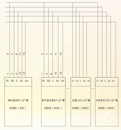 XY―2型系列產品廣泛應用于冶金、電力等行業(yè)的有線對講系統(tǒng),在天車上其主站安裝在司機室,分站可以分布在電力室內、高壓室、大小車上和天車登機門。該系統(tǒng)由若干臺廣播對講機組成一個機內通訊網絡,各個有線廣播站內置揚聲器和送受話器,任何一個廣播站喊話,其余話站均能接通廣播?梢允股a人員方便地與天車操作人員取得聯系。在各個站操作時無需撥號,可以方便的實現一對一講話,各話站并列接線,用戶可根據工藝要求任意擴充,每個話站都是一個獨特的系統(tǒng),任一臺損壞,不會影響其余分站正常工作。在起重設備上可以方便地實現上下車聯系,機內操作人員相互通訊。接線原理框圖參見附錄。