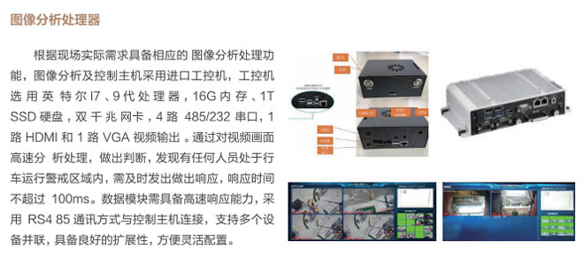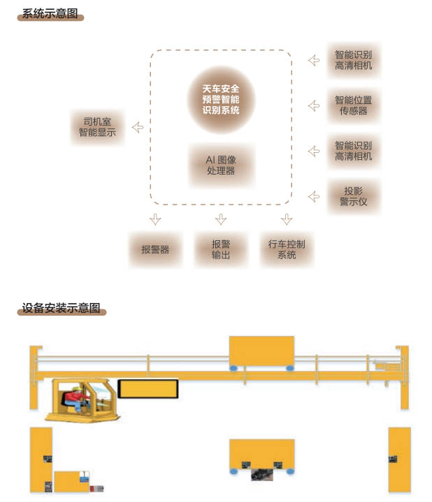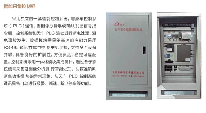 6、行車(chē)智控系統(tǒng):控制系統(tǒng)采用一體化模塊集成設(shè)計(jì), 通過(guò)各子系統(tǒng)信號(hào)采集及圖像分析進(jìn) 行智能處理,快速準(zhǔn)確判斷各功能模 塊的異常現(xiàn)象,與主機(jī)PLC控制系統(tǒng) 通訊連接具備自動(dòng)進(jìn)行報(bào)警、減速、斷電停車(chē)等功能,當(dāng)系統(tǒng)確認(rèn)發(fā)出信號(hào)指令后,控制系統(tǒng)和行車(chē)PLC連鎖進(jìn)行斷電處理,避免事故發(fā)生。